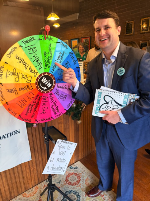 [PHOTOS: Left – Heart of MS Gives community members spin a wheel to find out where they are donating, Right – SHARE Cenla team at their launch party]