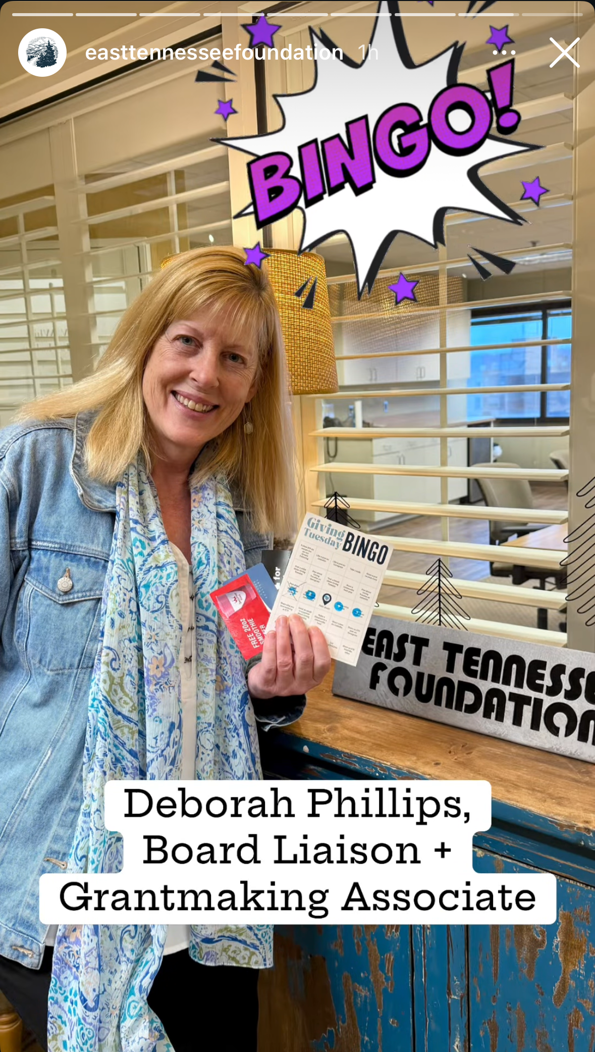 - East Tennessee Foundation brought the energy for East TN Gives on GivingTuesday with their entire staff playing bingo in the office while sending personalized thank-you messages to their many new donors throughout the day.
