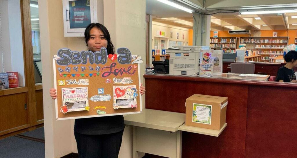 One project, led by Spark Ambassador Kyria Lim, created a pinboard called Send a Little Love in a local library. The installation encouraged visitors to participate in a simple exchange of generosity. Community members could write inspirational messages or book recommendations on blank notecards and leave them behind for others to discover. A second box allowed anyone to take a card if they needed encouragement, turning a quiet corner of the library into a space for small, meaningful acts of care.