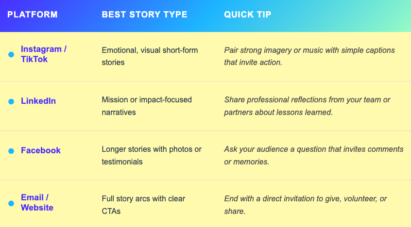 Each platform amplifies your story in a different way—the key is to match your format to your audience’s mindset.