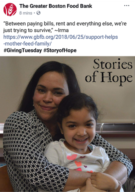 No video? No problem. While video is consistently the most engaging form of social media content, your organization can use a compelling photo and caption, like the Great Boston Food Bank: