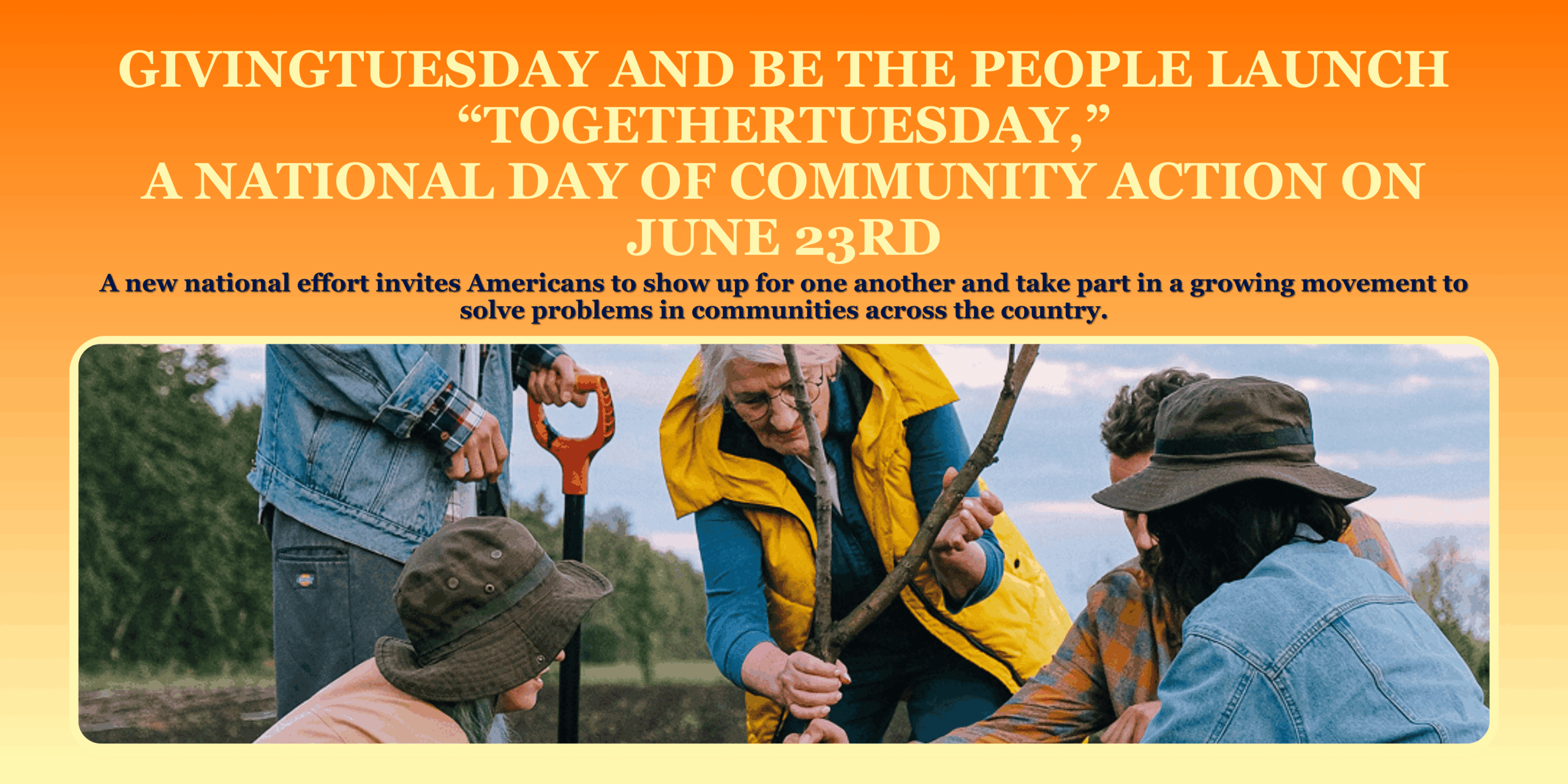 NEW YORK, NY – April 7, 2026 – Today, GivingTuesday, in partnership with Be The People, announced TogetherTuesday, a national day of community action on June 23, 2026. The effort builds on GivingTuesday’s work to mobilize millions in the spirit of giving, in collaboration with Be The People, a national call to action connecting community-led organizations with Americans ready to help solve problems, share stories of contribution, and inspire others to do the same.